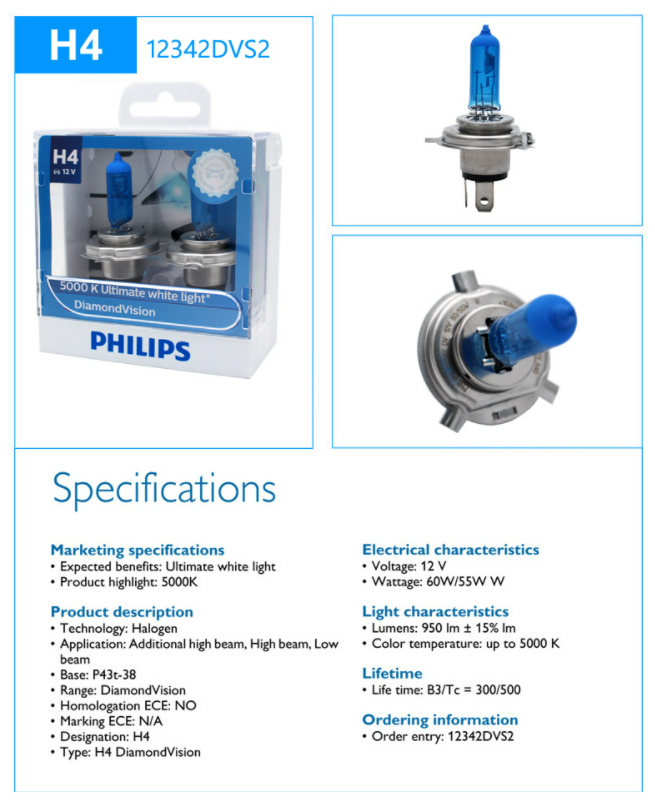 2 x H4 55 Watt 12V Philips Diamond Vision Lampen