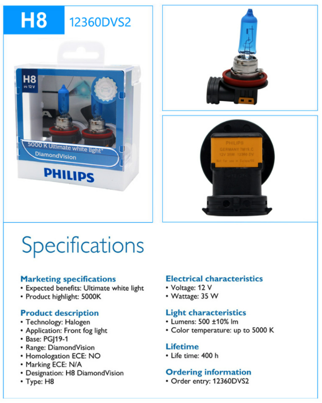 2 x H8 35 Watt 12V Philips Diamond Vision Lampen