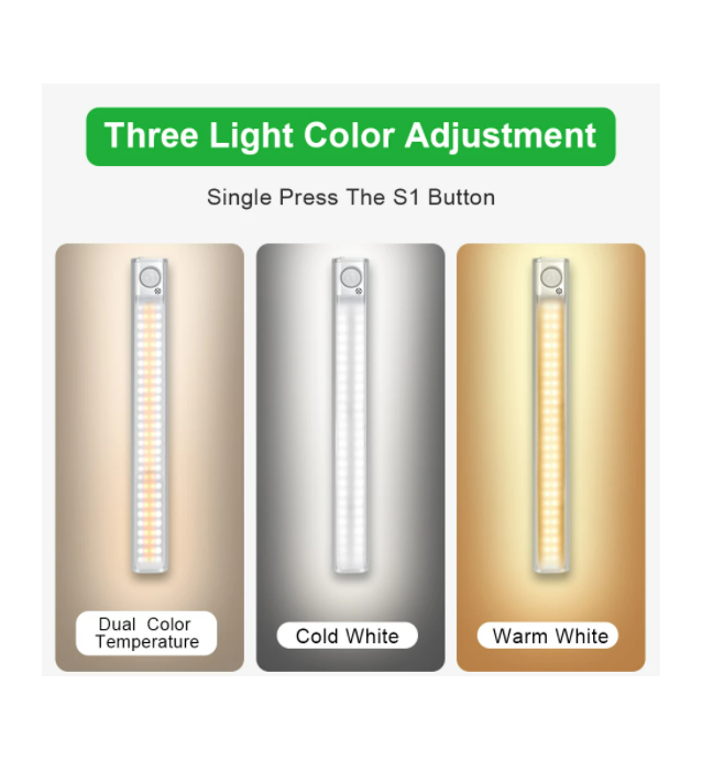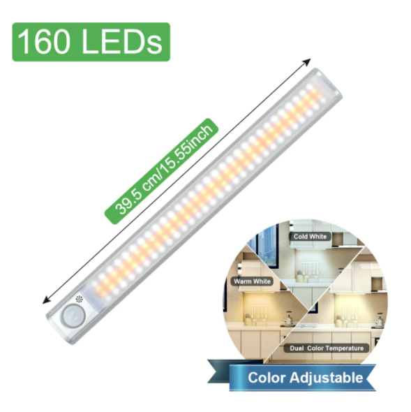Deze smalle en dunne sensor LED lamp heeft 160 LED's en een ingebouwde oplaadbare accu. Daarnaast kan bij deze LED sensorlamp zowel de felheid van het licht worden ingesteld als de kleur (wit, wit-geel of geel). De onderkant is magnetisch en er wordt een metalen plakstrip bijgeleverd.