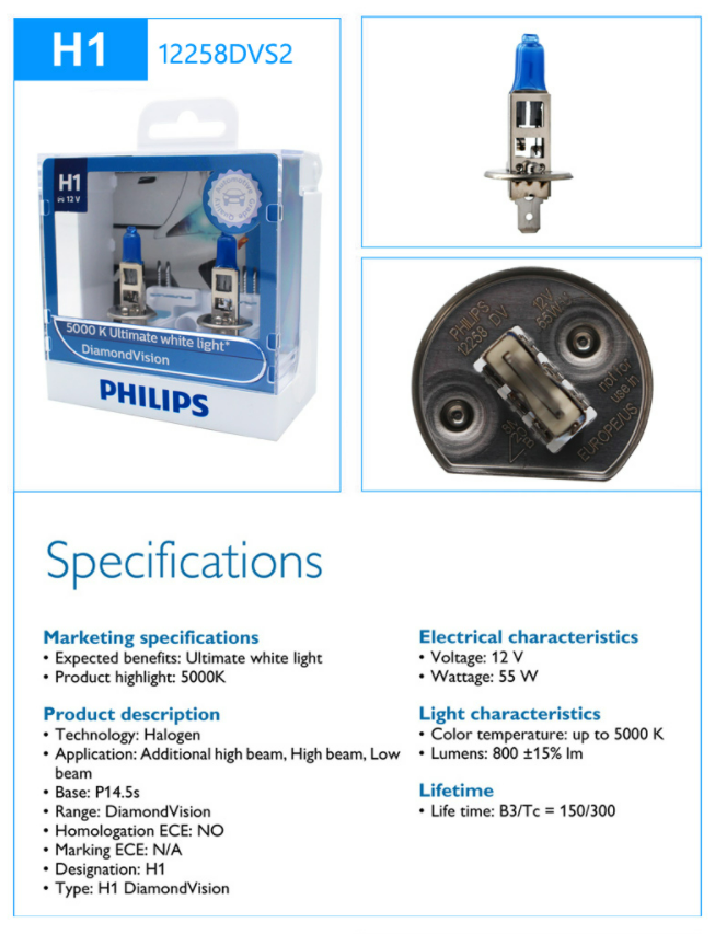 Bent u op zoek naar vervangingslampen of naar een upgrade voor uw koplampen maar u wilt niet overstappen op Xenon of LED? Dan zijn deze Philips Diamond Vision lampen de beste keuze! De 5000K kleurtemperatuur van deze lampen behaalt een close kleur match met fabriek uitgerust HID of LED koplampen en leveren dus een mooie witte kleur op de weg. De Diamond Vision lampen zijn vervaardigd in Duitsland door de toonaangevende fabrikant Philips, dus je kan worden verzekerd dat je de beste kwaliteit hebt.