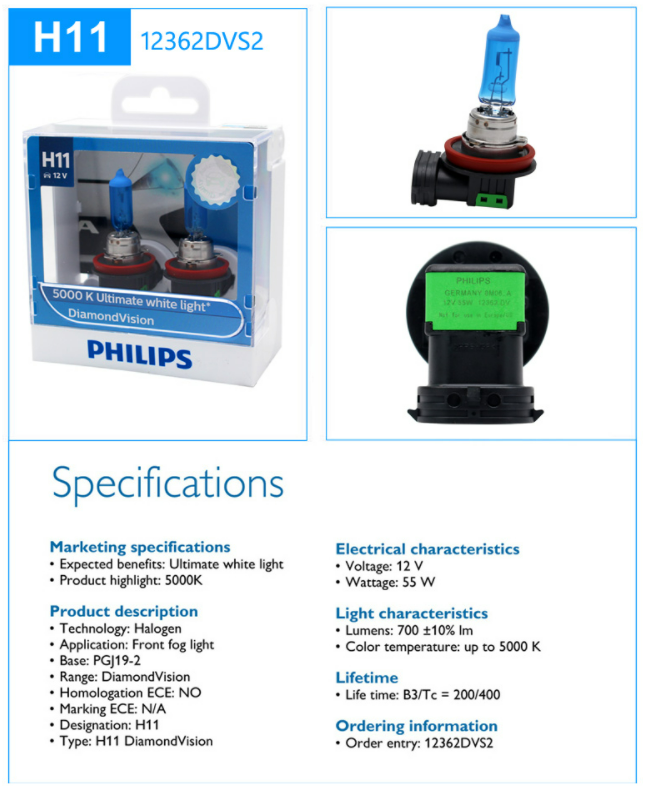2 x H11 55 Watt 12V Philips Diamond Vision Lampen